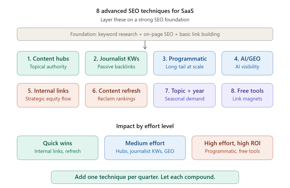 Advanced SEO techniques amplify results from a solid foundation. Jumping to programmatic SEO or journalist keywords before nailing basic keyword research and on-page optimization produces diminishing returns. Build the fundamentals first, then layer these advanced strategies one at a time.
